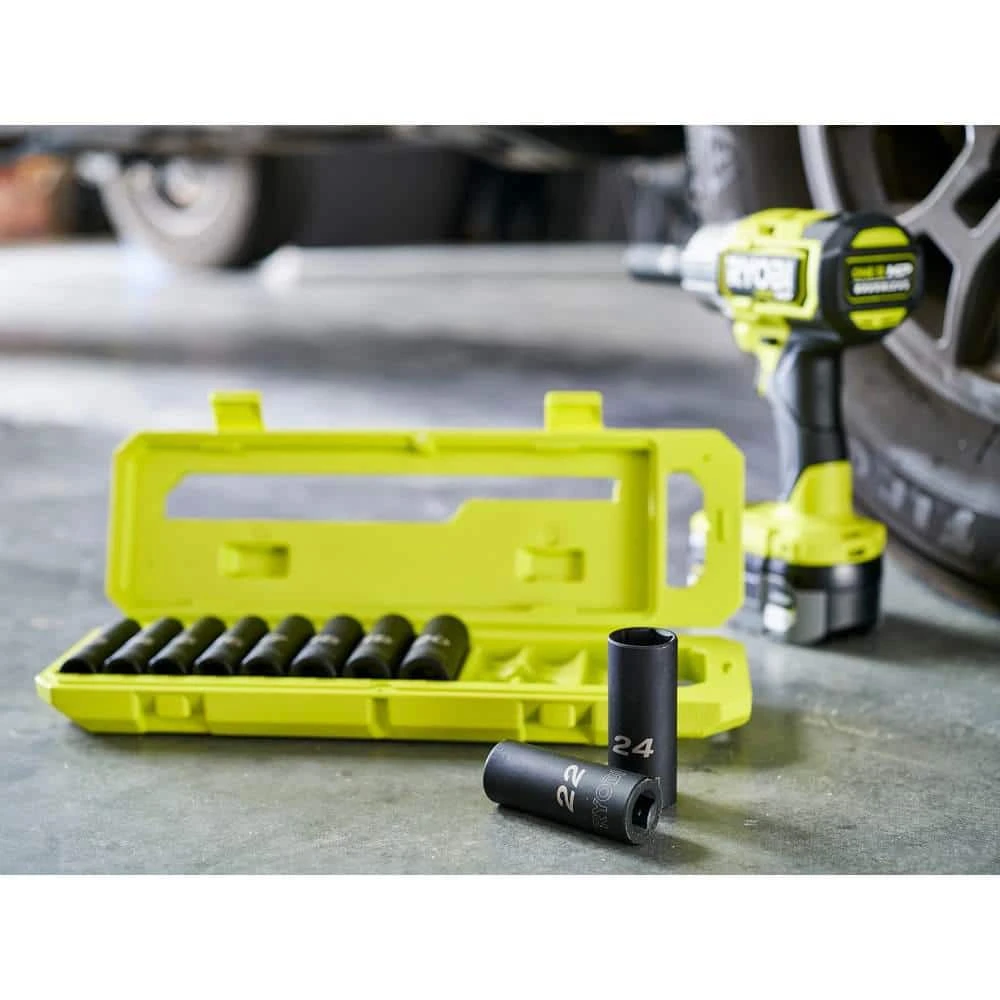 Complement your driving solutions with the RYOBI 11 PC. Metric 1/2 in. Drive Deep Impact Socket Set. This set has a 6 point design for maximum torque without rounding fasteners. The large size markings allow for quick and easy identification, saving time on the project. The thin wall, deep well design provides better access into tight spaces. Stay organized with the LINK wall storage compatible case. Complement your tool collection with RYOBI accessories. The 11 PC. Metric 1/2 in. Drive Deep Impact Socket Set is backed by the RYOBI limited lifetime warranty and includes (1) Case and (11) 1/2 in. Sockets: 13mm, 14mm, 15mm, 16mm, 17mm, 18mm, 19mm, 20mm, 21mm, 22mm, 24mm.