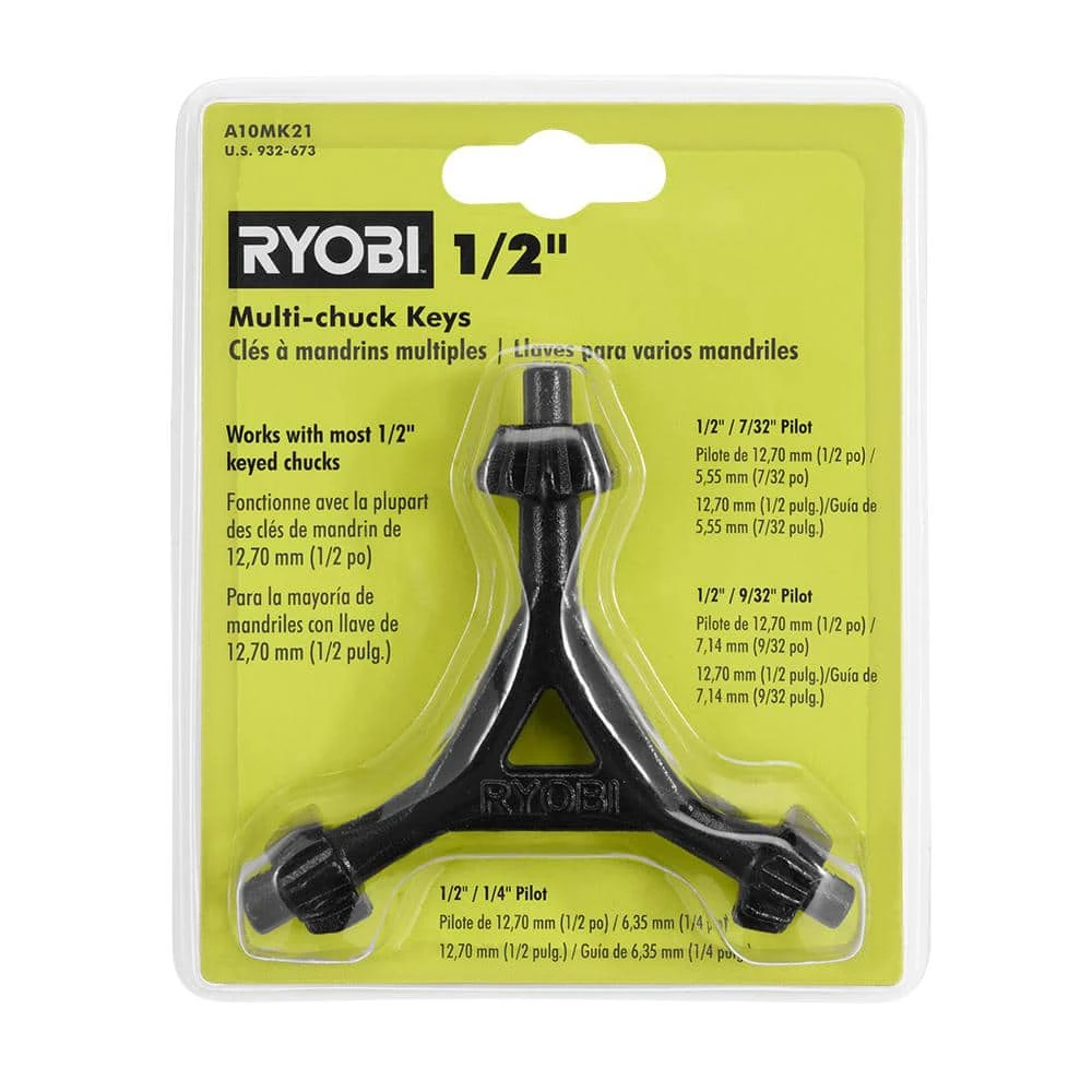 RYOBI introduces the 1/2 in. Multi-Chuck Key. This is a great replacement if the key for a drill’s chuck is lost. With the multiple pilot sizes, this will fit most drills. The functionality of the Multi-Chuck Key is improved with its durable, full metal construction with black oxide coating for increased life. The triangle design helps to increase torque while securing a bit into the drill chuck.