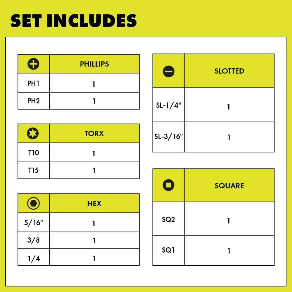 - Includes: (1) Handle, (1) PH1, (1) PH2, (1) SL-1/4 in., (1) SL-3/16, (1) SQ1, (1) SQ2, (1) T10, (1) T15, (1) HEX 5/16 in., (1) HEX 3/8 in., (1) HEX 1/4 in.