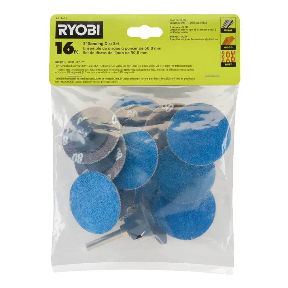 RYOBI introduces the 2 in. Sanding Disc Set (16-Piece). This set is ideal for sanding on metal, wood, and rust. It is compatible with RYOBI 18V ONE+ HP Compact Brushless 1/4 in. Right Angle Die Grinder (PSBDG01) and most 1/4 in. die grinders. The sanding pads feature a 2 in. diameter with a twist and lock attachment method that allows for quick and accurate pad alignment. This wide assortment includes sanding discs with grits ranging from 40 to 80. This set is great for applications including metal, wood, and rust. This set includes (1) 2 in. Twist and Lock Backer Pad with 1/4 in. Shank, (5) 2 in. 40 Grit Twist and Lock Sanding Disc, (5) 2 in. 60 Grit Twist and Lock Sanding Disc, and (5) 2 in. 80 Grit Twist and Lock Sanding Disc.