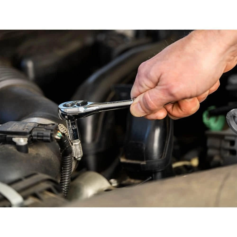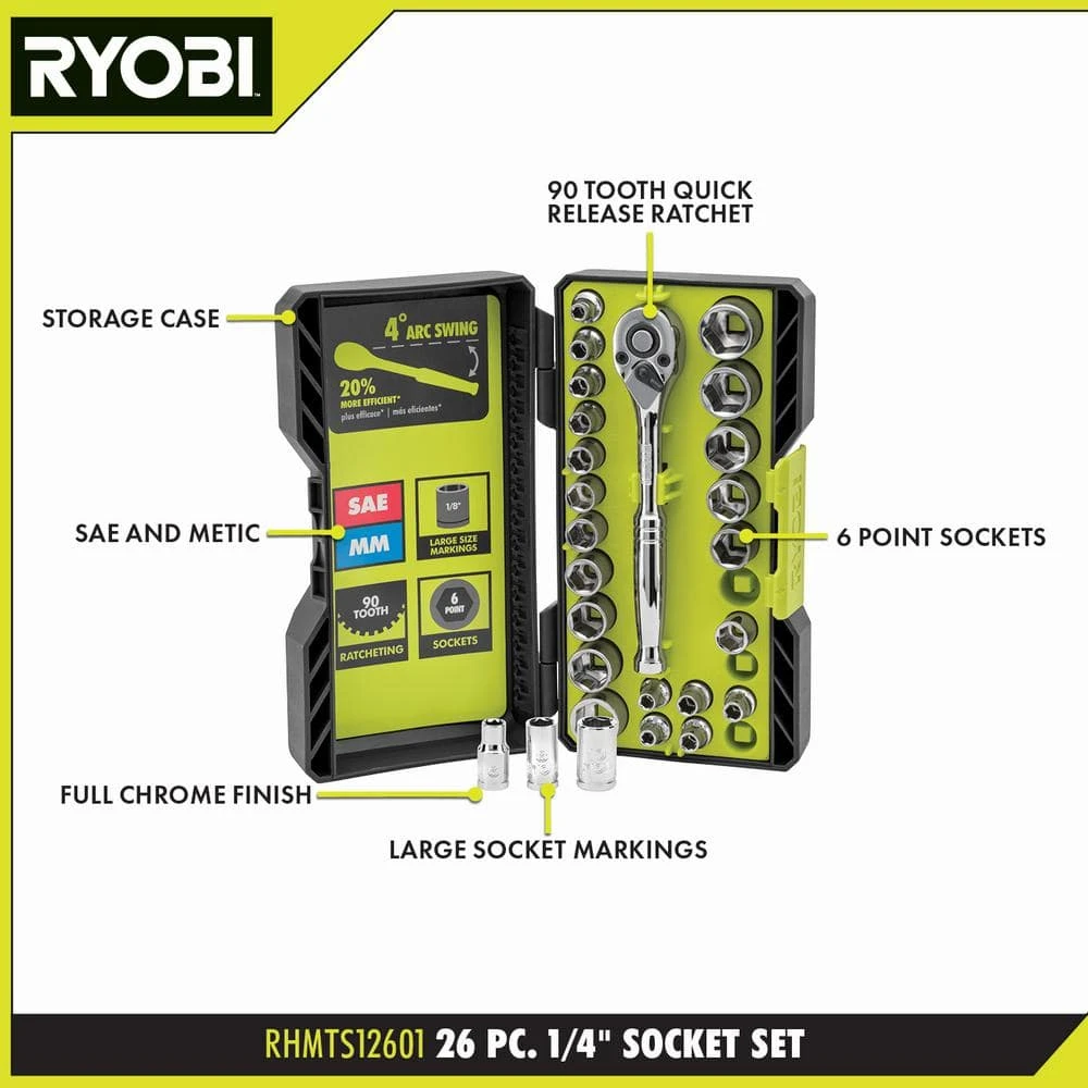 The RYOBI 26-Piece 1/4 in. Drive Ratchet and Socket Set has a 90 tooth ratchet, providing a 4 degree arc swing for 20% more efficiency in tight spaces. The large size markings allow for quick and easy identification, saving time on the project. 6 point sockets provide maximum torque without rounding fasteners. The quick release ratchet allows for efficient socket changes and the chrome finish resists corrosion. Keep everything organized with the included storage case. Included is (1) 1/4 in. Drive Ratchet and 5/32 in., 3/16 in., 7/32 in., 1/4 in., 9/32 in., 5/16 in., 11/32 in., 3/8 in., 7/16 in., 1/2 in., 9/16 in., 4mm,4.5mm, 5mm, 5.5mm, 6mm, 7mm, 8mm, 9mm, 10mm, 11mm, 12mm, 13mm, 14mm, 15mm Sockets, and Case.
