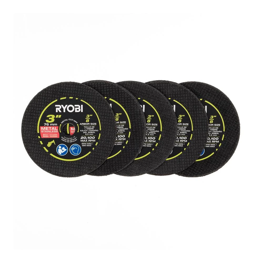 RYOBI introduces the 3 in. Aluminum Oxide Cut-Off Wheel Set (5-Piece). Aluminum oxide build for fast material removal and longer life. Compatible with RYOBI, RIDGID, Milwaukee, Worx, and Dremel Cut-Off Tools. Ideal for cutting wire shelving and metal. This set is a consumable item and includes (5) 3 in. Aluminum Oxide Cut-Off Wheels.