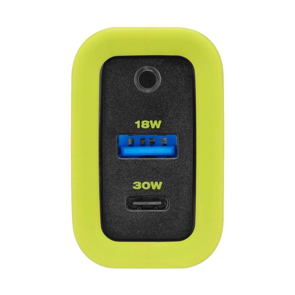 Experience fast charging with the RYOBI 30 Watt USB Wall Charger. With two charging ports, one USB-C, and one USB-A you can charge two devices at once. Whether it’s a smartphone, tablet, or any other USB device, this 2-port adapter is perfect to have when you need a charge. When traveling, conveniently fold the prongs down making it compact and easy to pack. Pair with RYOBI USB Cables for the ultimate RYOBI charging experience. Complement your tool collection with RYOBI Accessories.