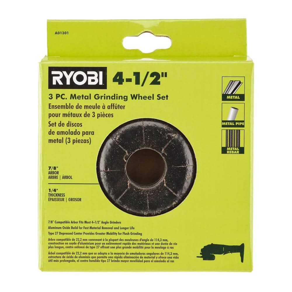 RYOBI introduces the 4-1/2 in. Metal Grinding Wheel. Aluminum oxide build for fast material removal and longer life. Will fit most 4-1/2 in. angle grinders. Able to grind through a variety of materials such as metal, metal pipe and metal rebar. These Grinding Wheels are a consumable item. Included in this package is (3) 4-1/2 in. Metal Grinding Wheel.