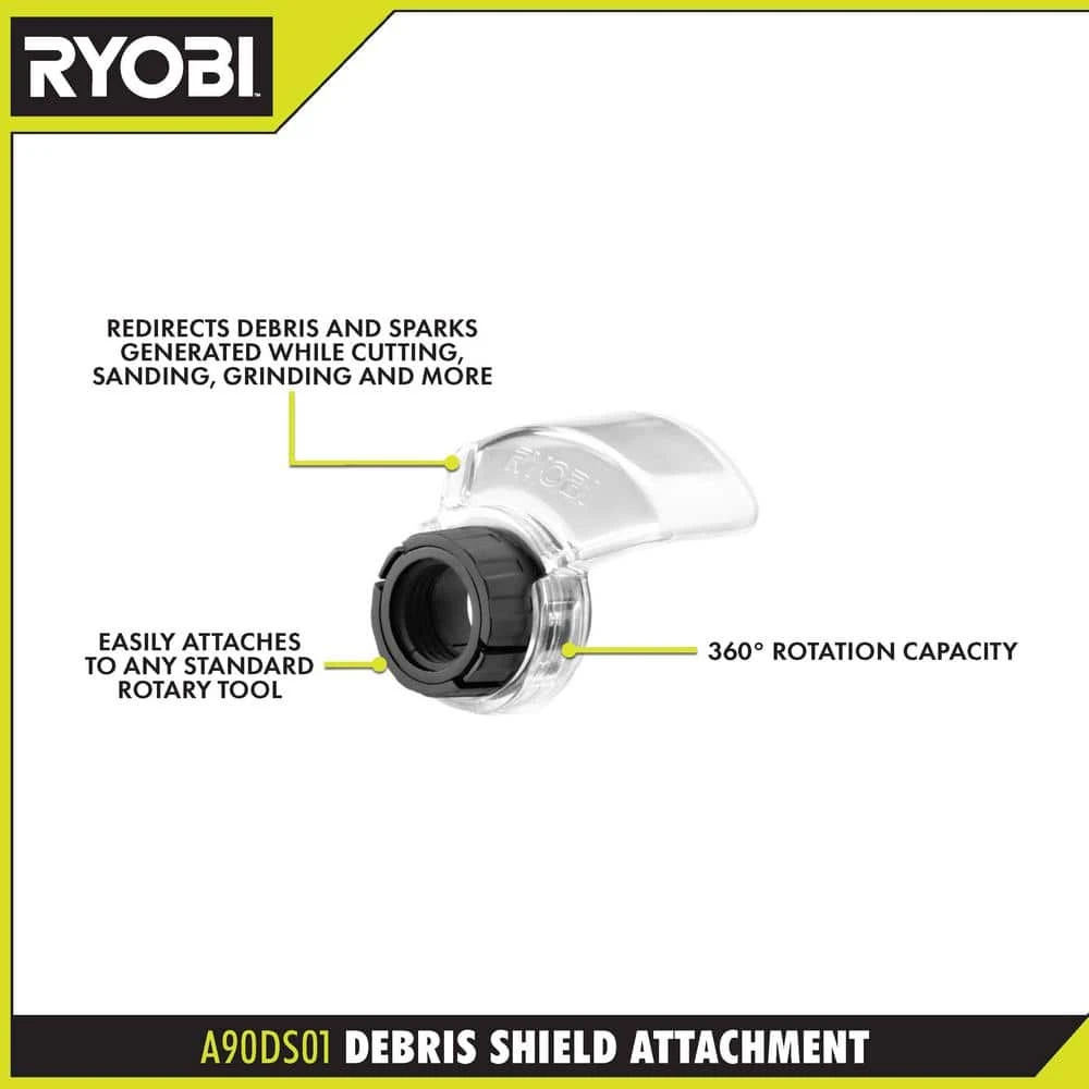The RYOBI Debris Shield Rotary Attachment redirects sparks and debris away from the user. The Debris Shield has 360 degree rotation allowing for quick adjustments and no interference with the work piece. This rotary shield is compatible with standard rotary tools and includes (1) Debris shield attachment, (1) 1-1/2 in. Twist Lock (TM) cut off wheel, (1) Twist Lock (TM) Mandrel, (1) 5/8 in. cylinder grinding stone, and (1) 3/4 in. carbon steel wire.