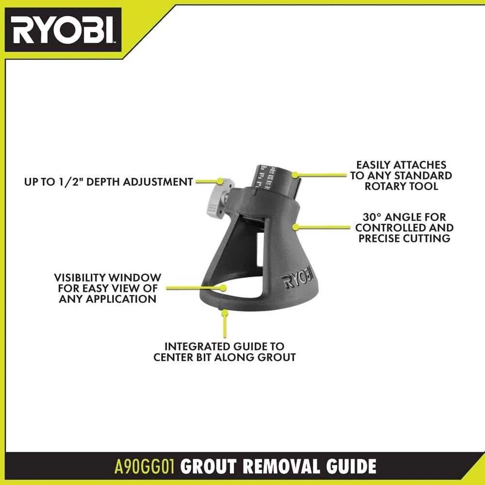 The RYOBI Grout Removal Rotary Kit removes wall and floor grout with ease. Featuring a 30 degree angle and a 1/2 in. depth adjustment capabilities for controlled and precise cuts. The large visibility window provides an easy view of the application while the integrated guides center the bit along the grout. This attachment is compatible with standard rotary tools and the kit includes (1) grout removal guide (1) 1/8 in. grout removal bit.