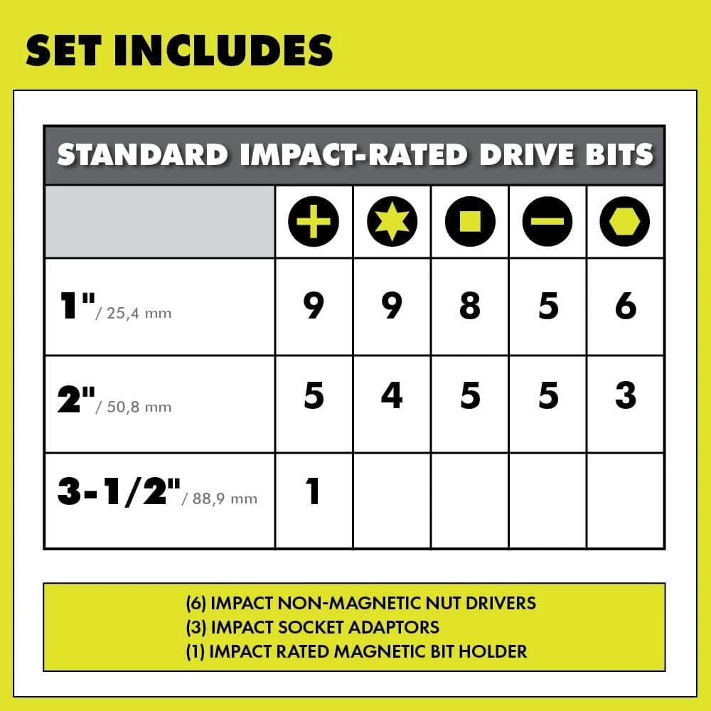 - Includes: A967001 (60) impact driving bits, (6) impact non-magnetic nut drivers, (3) impact socket adaptors and (1) impact rated magnetic bit holder