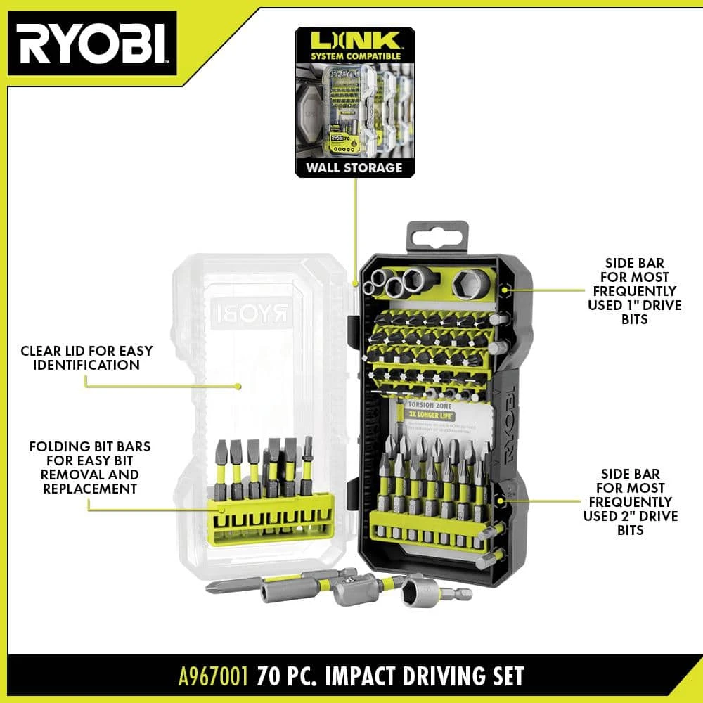Complement your driving solutions with the RYOBI 70 PC. Impact Driving Set, perfect for all screw driving applications. Precision-milled bit tips allow for enhanced fitment in commonly used fasteners to reduce stripped screws. The 2
