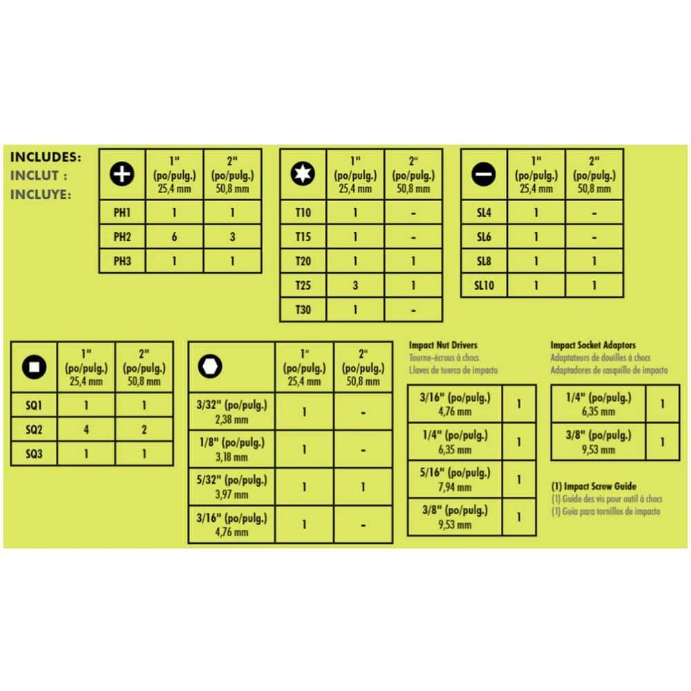 - Includes: (50) Impact Rated Bits in a variety of socket adaptors, nut drivers, driver bits, and bit holders