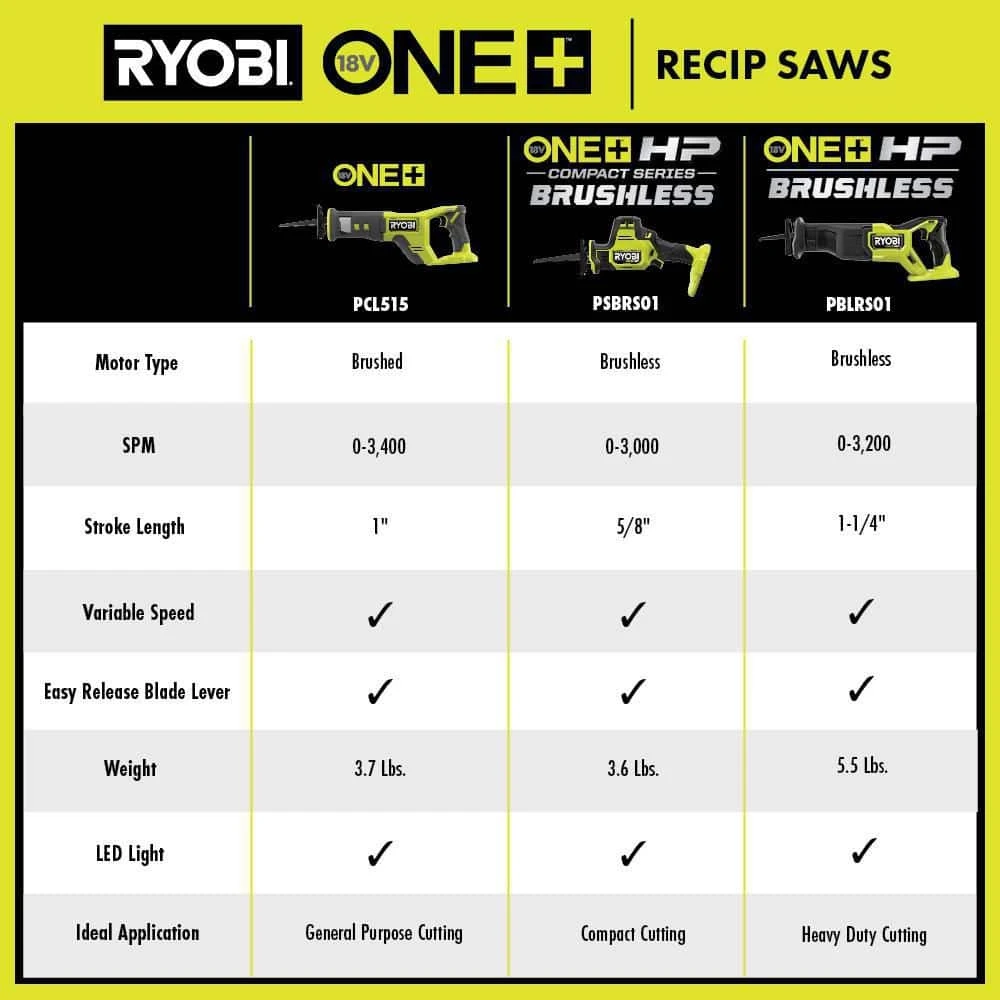 - Includes: PCL515 18V ONE+ Cordless Reciprocating Saw, 6 in. Wood Cutting Blade, and Operator’s Manual