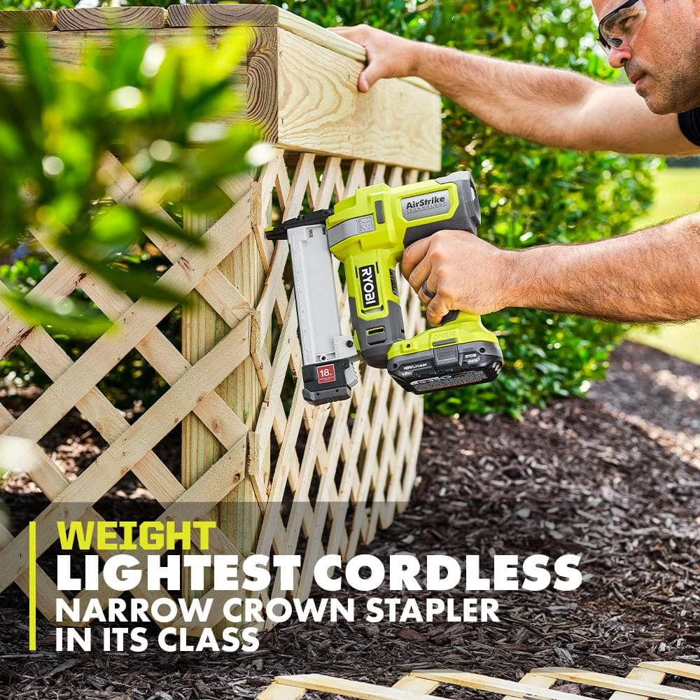 Expand your RYOBI 18V ONE+ System with the 18V ONE+ AirStrike 18GA Narrow Crown Stapler, and enjoy the convenience of AirStrike Technology, eliminating the need for noisy compressors, bulky hoses and expensive gas cartridges. This means faster setup and easy maneuverability on the job site. The RYOBI P361 Narrow Crown Stapler is capable of sinking up to 1-1/2 in. staples in hardwoods. Additionally, it is the lightest cordless narrow crown stapler in its class, helping prevent user fatigue. This stapler allows for extended periods of continuous work by sinking up to 1,700 staples per charge. It also offers a 26% smaller driver blade for superior drive quality, compared to P360. There is a tool-free depth of drive adjustment that allows for proper setting of nail heads. Great for lattice work and floor underlayment, this Crown Stapler is the perfect addition to any carpenter or DIYer’s tool collection. Best of all, it is part of the RYOBI 18V ONE+ System of over 300 Cordless Products that all work on the same battery platform. This 18V ONE+ AirStrike 18GA Narrow Crown Stapler is backed by the RYOBI 3-Year Manufacturer’s Warranty and includes the 18V Narrow Crown Stapler, (2) Non-Marring Pads, and Operator’s Manual. Battery and charger sold separately.
