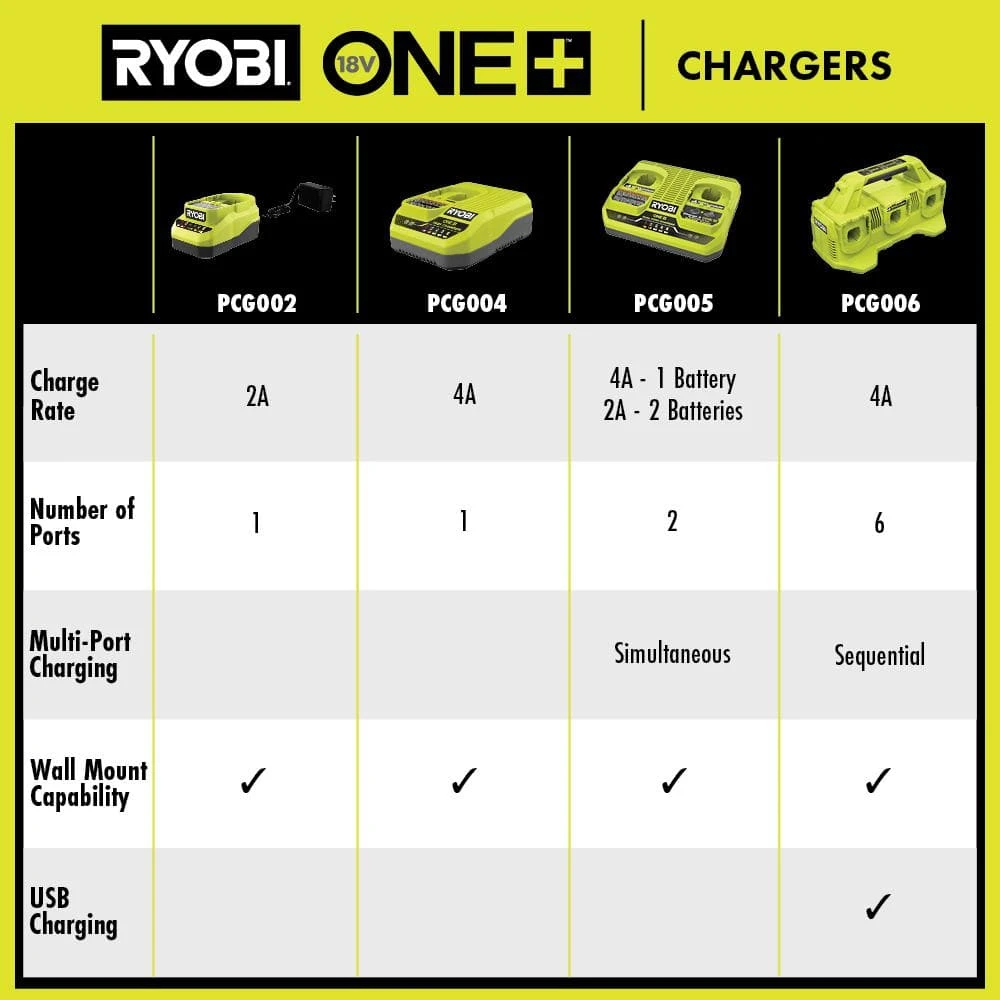 Expand your RYOBI 18V ONE+ System with the RYOBI 18V ONE+ 6-Port Fast Charger. With 30% faster charging than P135, this charger decreases downtime significantly. Made with convenience in mind, it can consecutively charge and maintain up to 6 18V ONE+ batteries. This charger includes a 2 Amp USB output allowing users to charge portable electronics. Featuring LED indicator lights, users can easily identify battery charge status. The Energy Save Mode conserves energy when not charging or maintaining batteries. To maximize workspace, the wall mount capability ensures organization at any given point. Best of all, it is part of the RYOBI 18V ONE+ System of over 300 Cordless Products that all work on the same battery platform. This 18V ONE+ 6-Port Fast Charger is backed by the RYOBI 3-Year Manufacturer’s Warranty and includes (1) PCG006 18V ONE+ 6-Port Fast Charger, (2) 6.0 Ah HIGH PERFORMANCE Batteries, and an operator’s manual.