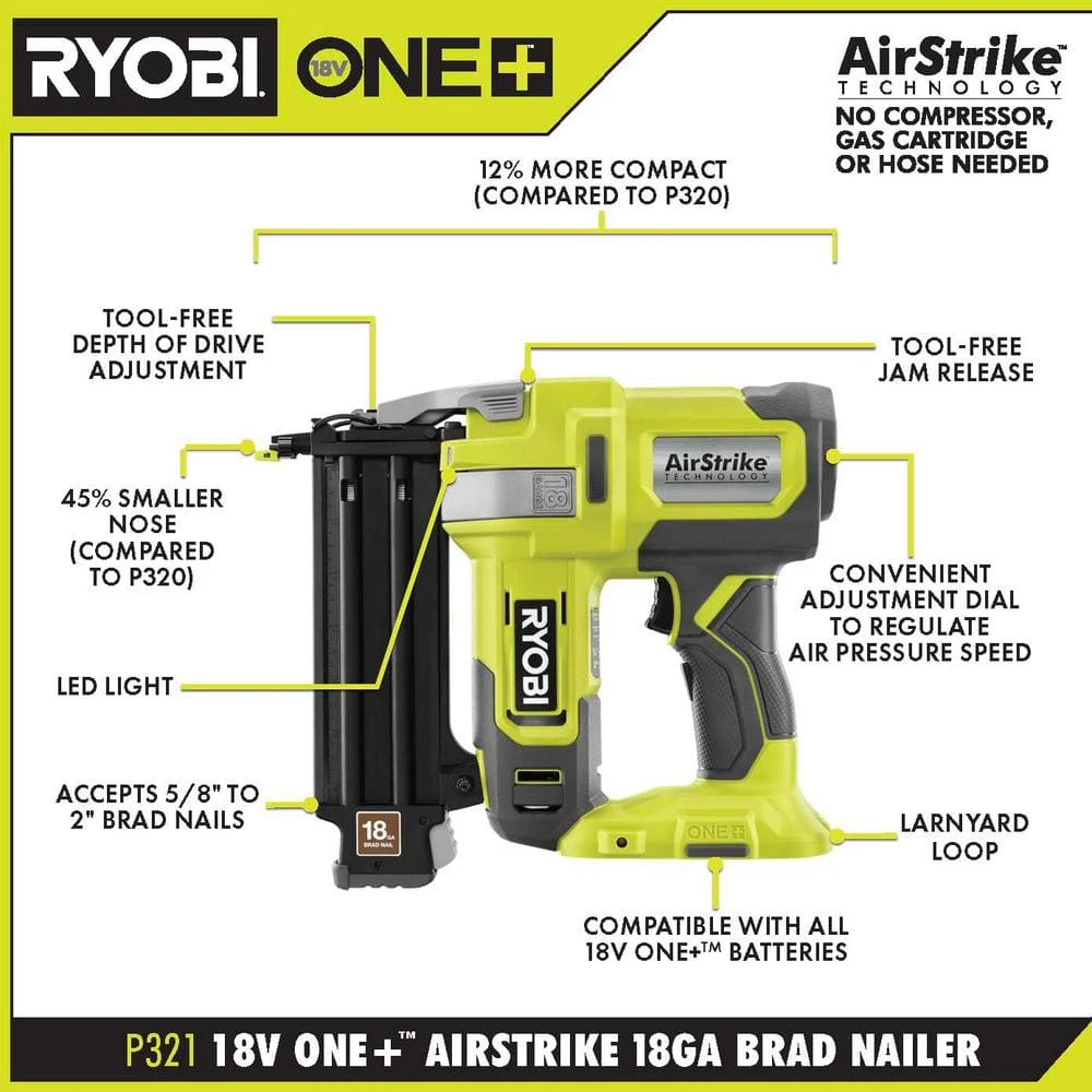 - 18-Gauge Brad Nailer: 12% more compact for enhanced maneuverability (compared to the RYOBI P320)
