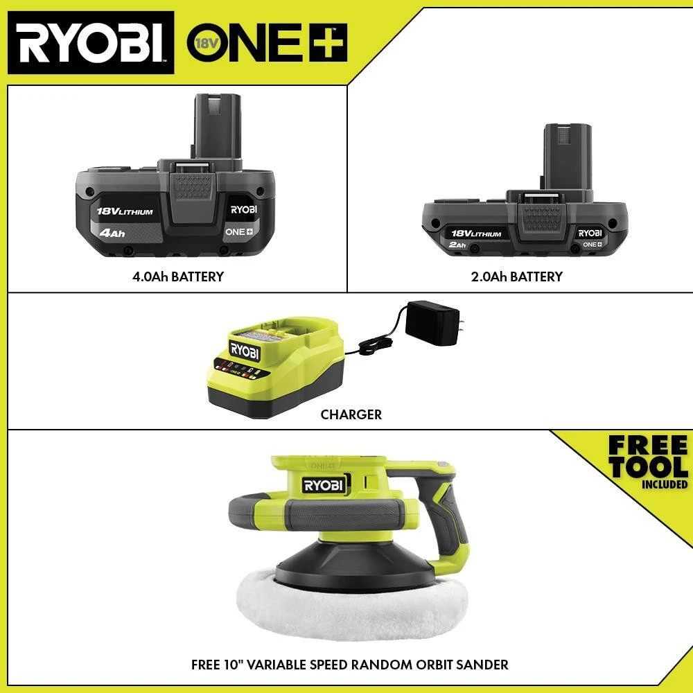 Expand your RYOBI 18V ONE+ System with the 18V ONE+ 10 in. Variable Speed Random Orbit Buffer Kit. Designed to tackle large surfaces, this tool has the capability to buff a full-sized vehicle with up to 2-1/2 hours of runtime. The variable speed dial provides greater control of up to 3,600 OPM, and the random orbit motion delivers a swirl-free finish. Complete a variety of projects easier with the multi-grip design for ultimate comfort and control. Best of all, it is part of the RYOBI 18V ONE+ System of over 300 Cordless Products that all work on the same battery platform. This 18V ONE+ 10 in. Variable Speed Orbital Buffer Kit is backed by the RYOBI 3-Year Manufacturer’s Warranty and includes PCL465 18V ONE+ 10 in. Variable Speed Random Orbit Buffer, Applicator Bonnet, Buffing Bonnet, PBP005 18V ONE+ 4Ah Lithium Battery, PBP003 18V ONE+ 2Ah Lithium Battery, Charger and Operator’s Manual.