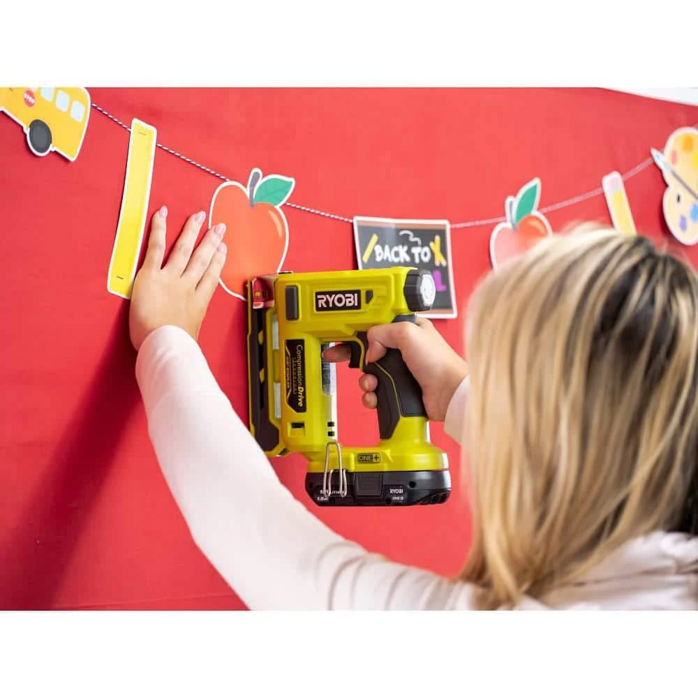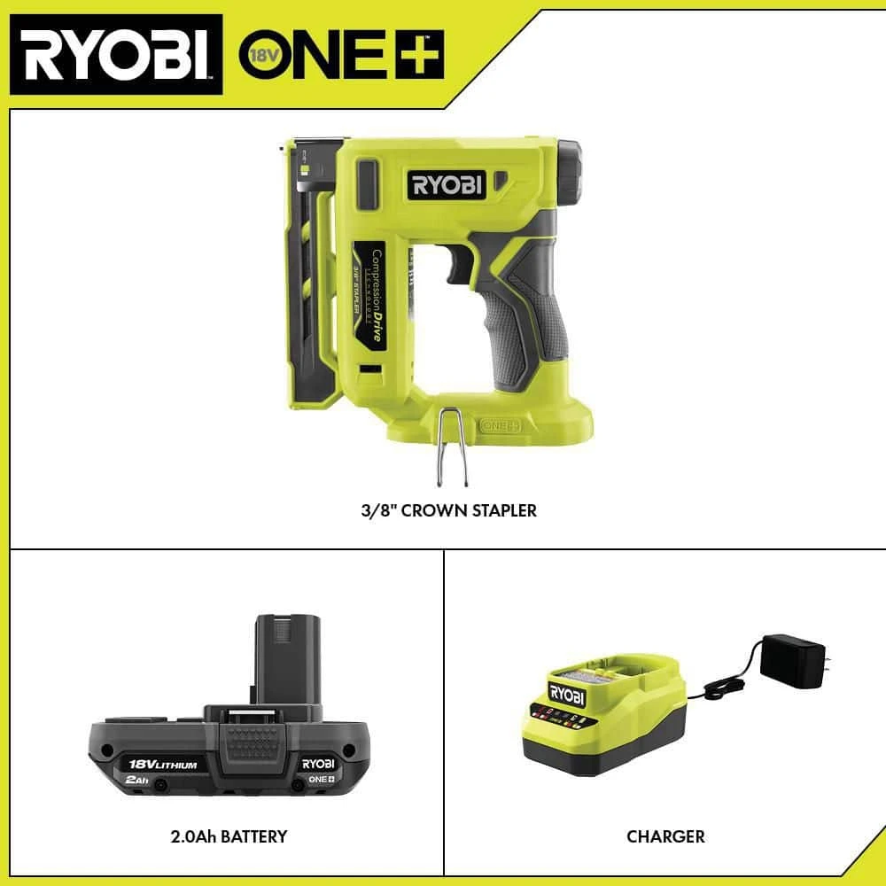 RYOBI introduces the 18V ONE+ Cordless Compression Drive 3/8 in. Crown Stapler Kit with 2.0 Ah Battery and Charger. The ONE+ Stapler utilizes Compression Drive Technology that uses automated convenience to eliminate user fatigue. With the ability to drive over 2,750 staples with the included 2.0 Ah Battery, users are guaranteed to get the job done on a single charge. The RYOBI ONE+ Stapler allows you to control your depth of drive with an adjustable knob for improved accuracy throughout various materials. The included screen/wire attachment helps users guide staples without penetrating wire or screen. This stapler is compatible with ARROW T50 staples and fastens a wide range of staples from 1/4 in. to 9/16 in. Best of all, it is part of the RYOBI ONE+ System of over 300 Cordless Products that all work on the same battery platform. Backed by the RYOBI 3-Year Manufacturer’s Warranty, the 18V ONE+ Cordless Compression Drive 3/8 in. Crown Stapler includes a belt clip, a dual screen/wire attachment, a 2.0 Ah Battery, Charger, and operator’s manual.