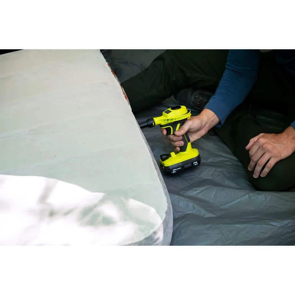 Expand your RYOBI 18V ONE+ System with the RYOBI 18V High Volume Power Inflator. This cordless tool is perfect for fast, high volume inflating and deflating of air mattresses and pool toys. It can inflate a standard twin air mattress in 45 seconds. This tool is not just limited to inflation and deflation, it can also be used as a portable benchtop blower to keep your work surfaces clean from sawdust or debris. It’s high volume output can be utilized to accelerate charcoal readiness time on your grill.The pistol grip handles with GRIPZONE overmold to provide user comfort as well as a locking trigger feature that prevents user fatigue. These features will help you power through any job effortlessly. Best of all, it is part of the RYOBI ONE+ System of over 300 Cordless Products that all work on the same battery platform. This RYOBI 18V ONE+ High Volume Power Inflator is backed by the RYOBI 3-Year Manufacturer’s Warranty and includes (1) P738 18V ONE+ High Volume Power Inflator, High Volume Nozzle, Pinch Valve Adapter and Operator ft.s Manual. Battery and charger sold separately.