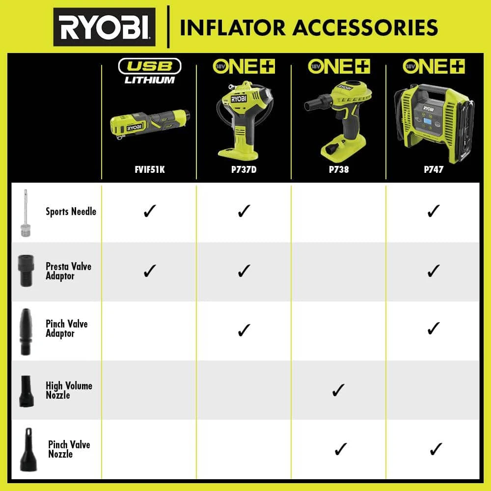 - Includes: (1) P738 18V ONE+ High Volume Power Inflator, High Volume Nozzle, Pinch Valve, and Operator’s Manual