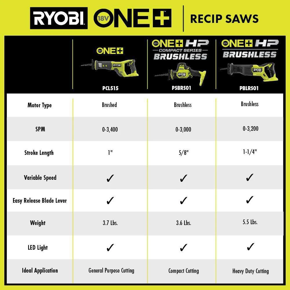 - Includes: FREE (1) PBLRS01B 18V ONE+ HP Brushless Reciprocating Saw, (1) 6 in. Wood Blade, and Operator’s Manual
