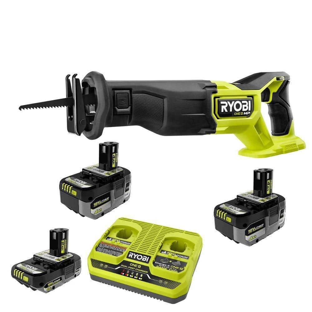 RYOBI introduces the 18V ONE+ HIGH PERFORMANCE Kit w/ (2) 4.0 Ah Batteries, 2.0 Ah Battery, 2-Port Charger, and FREE ONE+ HP Brushless Reciprocating Saw. INTELLICELL battery technology features advanced electronics allowing batteries to last longer, think smarter and deliver up to 30% more power. The COOL-CORE design reduces temperature to optimize battery performance and extend battery life. This dual port charger is compatible with all RYOBI 18V ONE+ batteries and allows users to charge two batteries at the same time. Featuring LED indicator lights, users can easily identify battery charge status. The 18V ONE+ HP Brushless Reciprocating Saw features a brushless motor, which provides 64% faster cutting and delivers over 380 cuts per charge, saving time and energy on the job. Best of all, it is part of the RYOBI 18V ONE+ System of over 300 Cordless Products that all work on the same battery platform. This 18V ONE+ Lithium HIGH PERFORMANCE Starter Kit is backed by the RYOBI 3-Year Manufacturer’s Warranty and includes PBP004 18V ONE+ 4.0 Ah Lithium HIGH PERFORMANCE Battery, PBP003 18V ONE+ 2.0 Ah Lithium HIGH PERFORMANCE Battery, PCG005 18V ONE+ Dual-Port Simultaneous Charger, and FREE 18V ONE+ HP Brushless Reciprocating Saw, 6 in. wood blade, and operator’s manual.