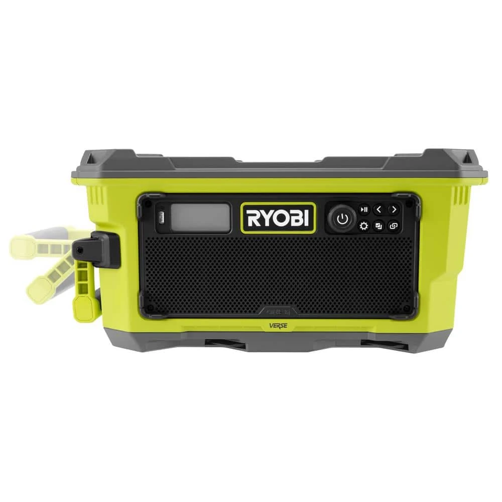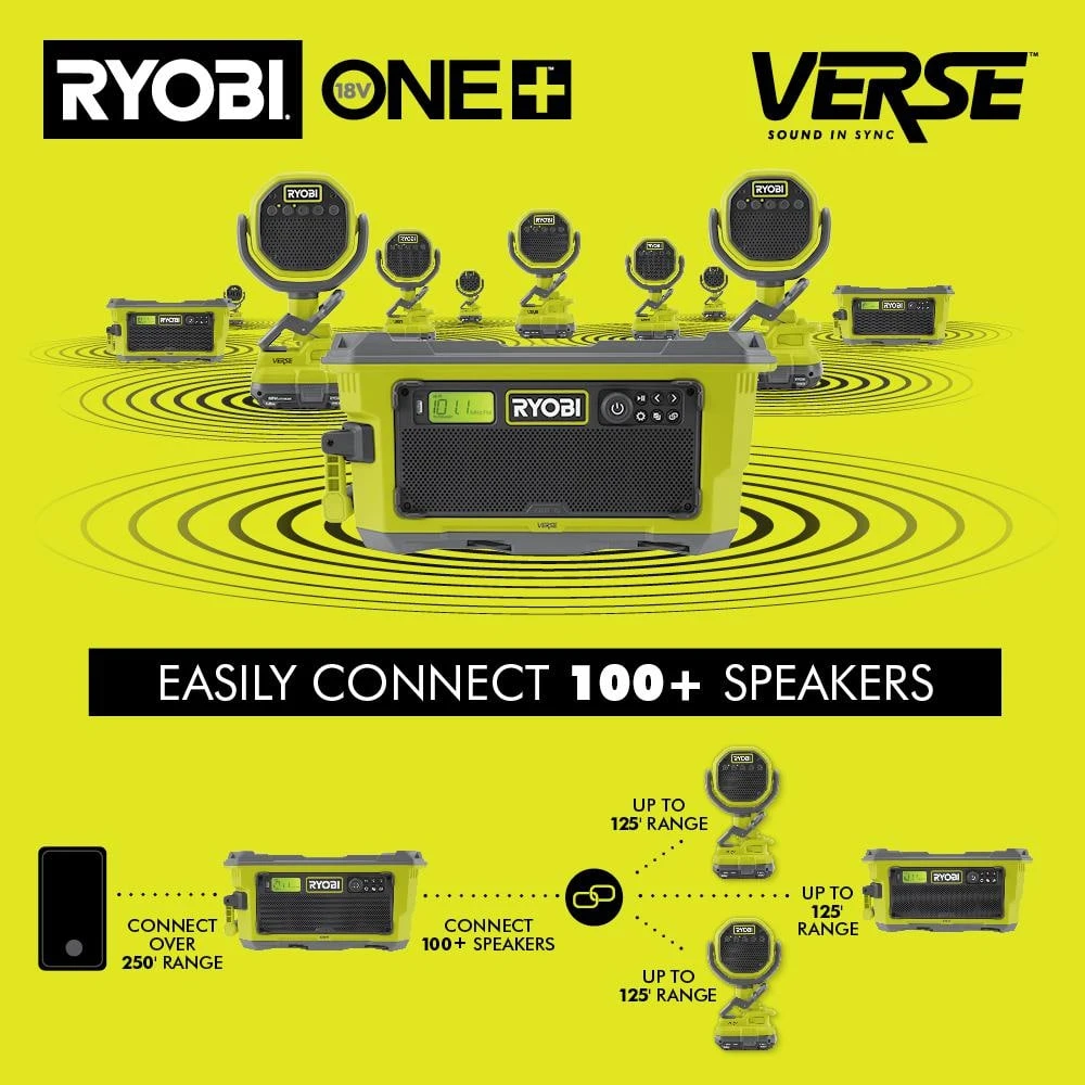 The RYOBI 18V ONE+ VERSE LINK Stereo takes studio-quality sound anywhere you go. Integrated 50W subwoofer & dual 15W midrange speakers create a more immersive listening experience by offering a wider sound stage for your listening needs. Stream from 1 speaker or for even greater sound, use the VERSE technology to connect any additional VERSE compatible speaker, no app required. Quickly & easily connect 100+ VERSE speakers with up to 125′ of speaker to speaker connection range. Listen to what you want where you want with 250’ of BLUETOOTH range & FM radio with 10 customizable presets. Select your dynamic listening experience with Hi-Fi, Bass+, Treble+ and Voice equalizer modes. Hi-Fi for best overall listening experience, Bass+ for boosting low end frequencies, Treble+ for boosting high-end frequencies and Voice for listening to your favorite podcast or audio book. Hybrid technology allows for up to 12 hours of runtime (using a 6Ah battery) or unlimited runtime when used with an extension cord, keeping you working as long as you need. Organize, access & transport with ease on the RYOBI LINK wall & mobile storage system with the LINK compatible base & collapsible handle. Best of all, it is part of the RYOBI ONE+ system where any 18V ONE+ battery works with any 18V ONE+ product. This 18V ONE+ VERSE LINK Stereo is backed by the RYOBI 3-year manufacturer’s warranty and includes PCL601B 18V ONE+ VERSE LINK Stereo & operator’s manuals. Battery and charger sold separately.