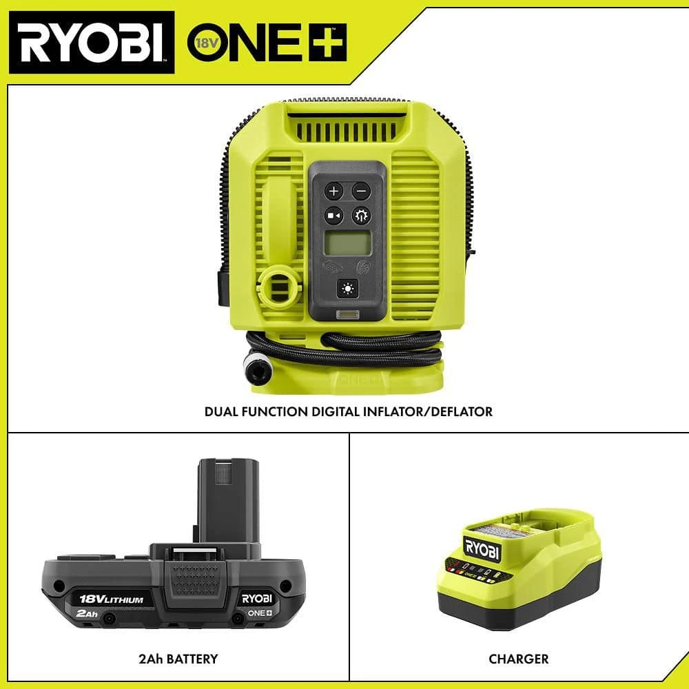 The RYOBI 18V ONE+ Dual Function Digital Inflator is ideal for a variety of applications ranging from filling tires/sports balls to inflation and deflation of air mattresses and pool toys. The high pressure inflation of up to 160 PSI and high volume inflation up to 16 SCFM ensure quicker and more efficient inflation. Filling tires is easier than ever with auto shut-off and the quick-connect air chuck for hands-free use. A digital pressure gauge provides clear and accurate measurement readings and the bright LED worklight allows for clear visibility no matter the environment. Take this inflator anywhere with the integrated carry handle and on-board accessory storage. Best of all, it is part of the RYOBI ONE+ System – Any 18V ONE+ Battery Works With Any 18V ONE+ Product. This 18V ONE+ Dual Function Digital Inflator/Deflator is backed by the RYOBI 3-Year Manufacturer’s Warranty and includes PCL031 18V ONE+ Dual Function Digital Inflator/Deflator, Sports Needle, Presta Valve Adaptor, Pinch Valve Adaptor, a 2.0 Ah Battery, Charger, and an operator’s manual.