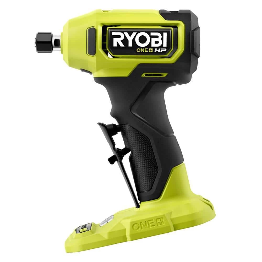 RYOBI introduces the industry’s first 18V Right Angle Die Grinder. The ONE+ HP 18V Compact Brushless 1/4 in. Right Angle Die Grinder is designed to live up to professional expectations, delivering a powerful solution in the most compact and lightweight design. Ideal for tight workspaces, the compact size allows for this die grinder to be used in areas where air hoses may mar the work surface or get in the way. Powered by a brushless motor, producing up to 22,000 RPM, this die grinder has 2 times the amount of power compared to pneumatic. It also features a 4-Mode Speed control and responsive variable-speed trigger for maximum control in any work environment. To make accessory changes quick and easy, use the on board spindle lock and single wrench. Best of all, it is part of the RYOBI ONE+ System of over 300 Cordless Products that all work on the same battery platform. Backed by the RYOBI 3-Year Manufacturer’s Warranty, this ONE+ HP 18V Compact Brushless Right Angle Die Grinder includes a wrench and operator’s manual. Batteries and chargers are sold separately.