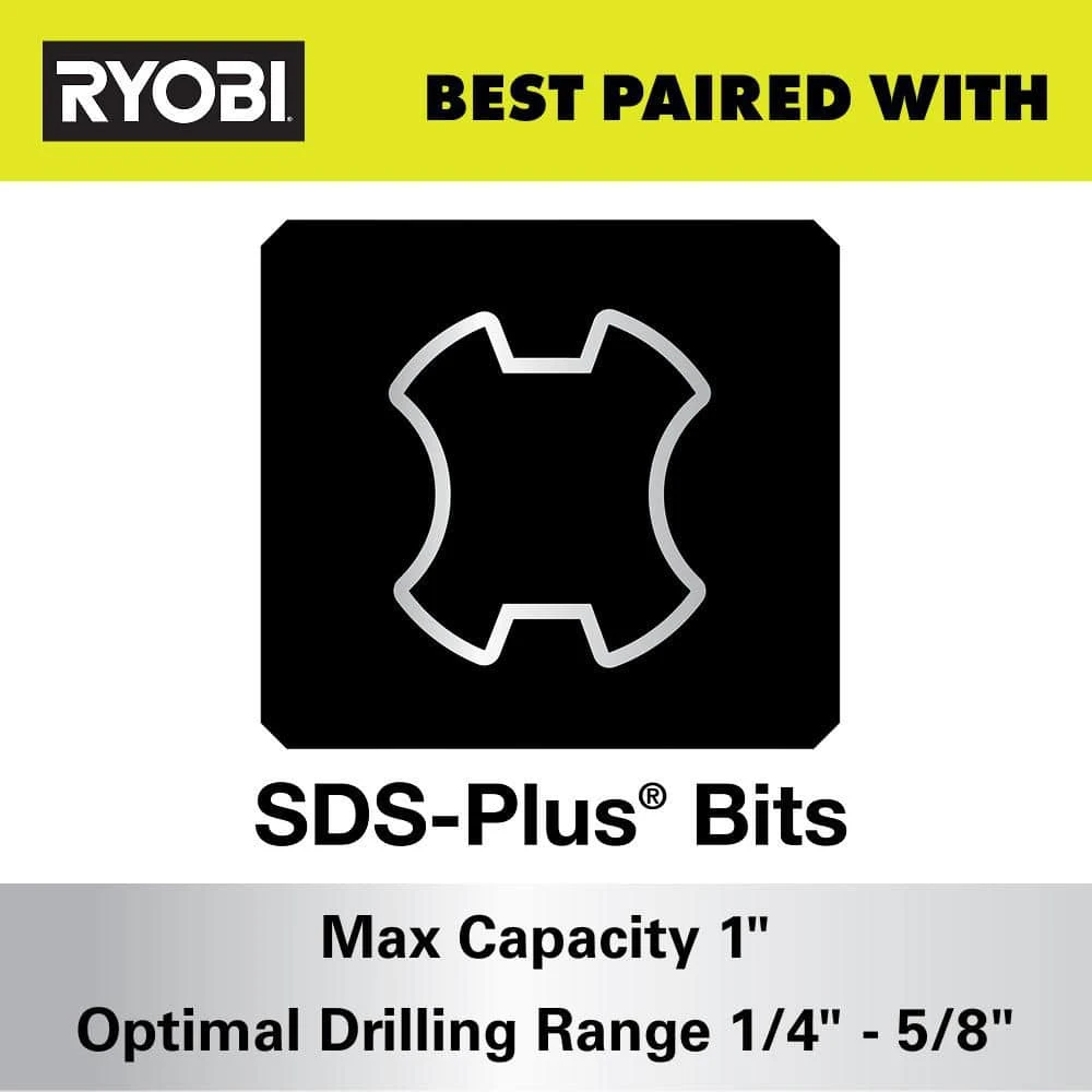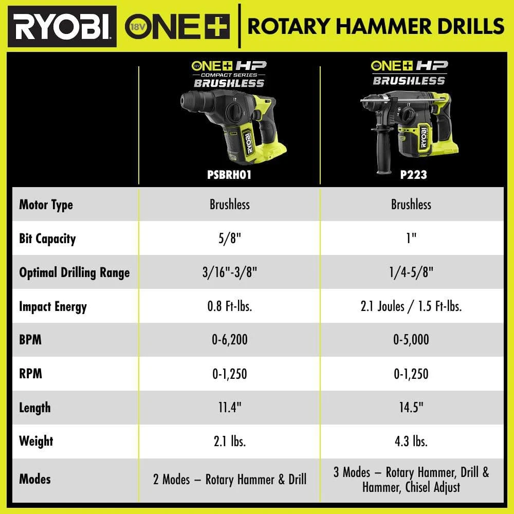 The RYOBI 18V ONE+ HP Brushless line of products is redefining power and performance. The RYOBI 18V ONE+ HP Brushless 1 in. SDS-Plus Rotary Hammer features a brushless motor delivering up to 75% more power and up to 2.1 Joules of impact energy, allowing users to dominate heavy duty applications faster and more efficiently. The anti-vibration handle reduces fatigue by providing up to 47% less vibration, leading users to be more efficient on the jobsite. Alternating between the 3 modes, Drilling, Hammer Drilling, and Hammer accommodates the need of any application or material. Additionally, an auxiliary handle and depth guide come included to allow for increased control and precision. Best of all, it is part of the RYOBI ONE+ System of over 300 Cordless Products that all work on the same battery platform. This rotary hammer is backed by the RYOBI 3-Year Manufacturers Warranty and includes the P223 18V ONE+ HP Brushless 1 in. SDS-Plus Rotary Hammer, auxiliary handle, depth guide, and operators manual. Battery and charger sold separately.