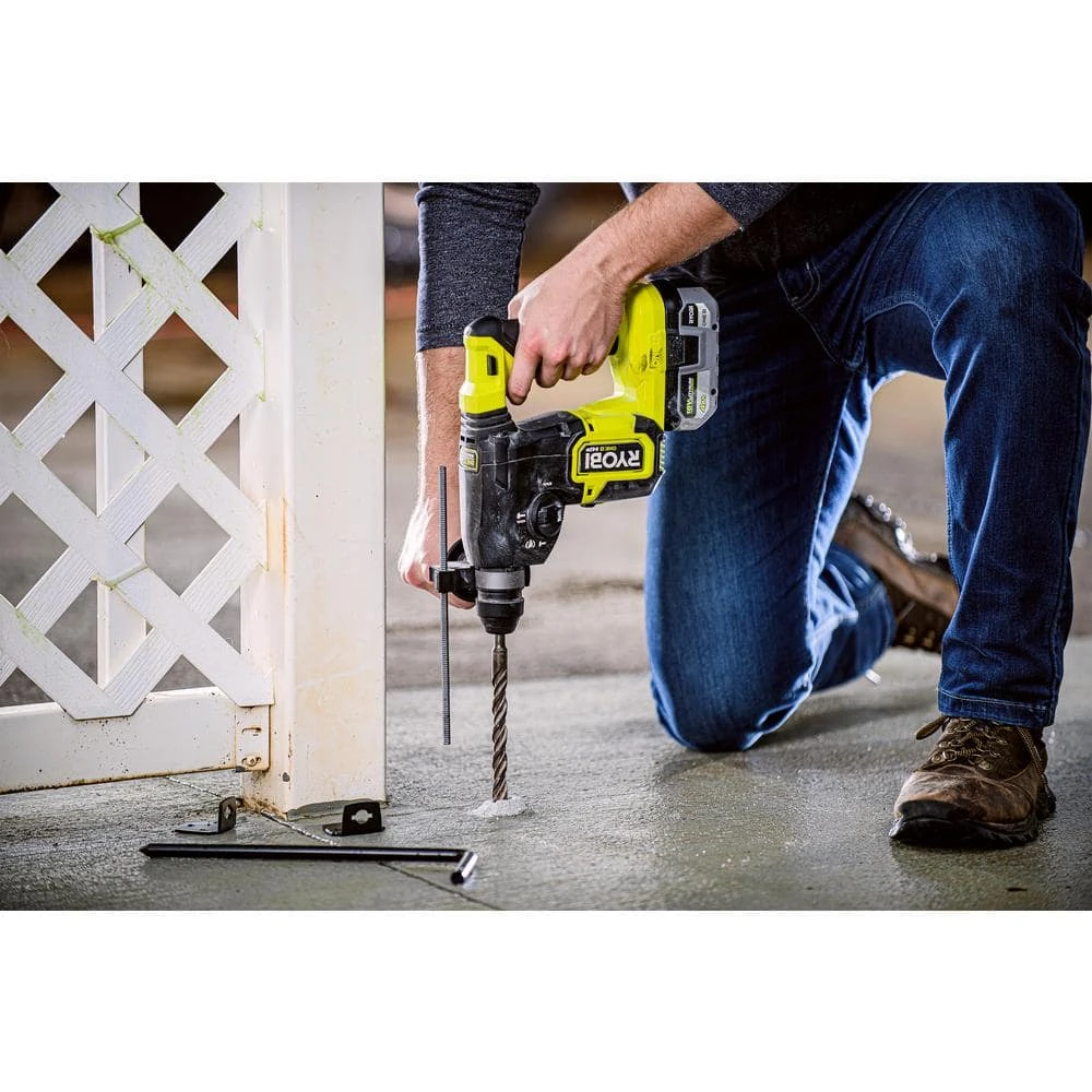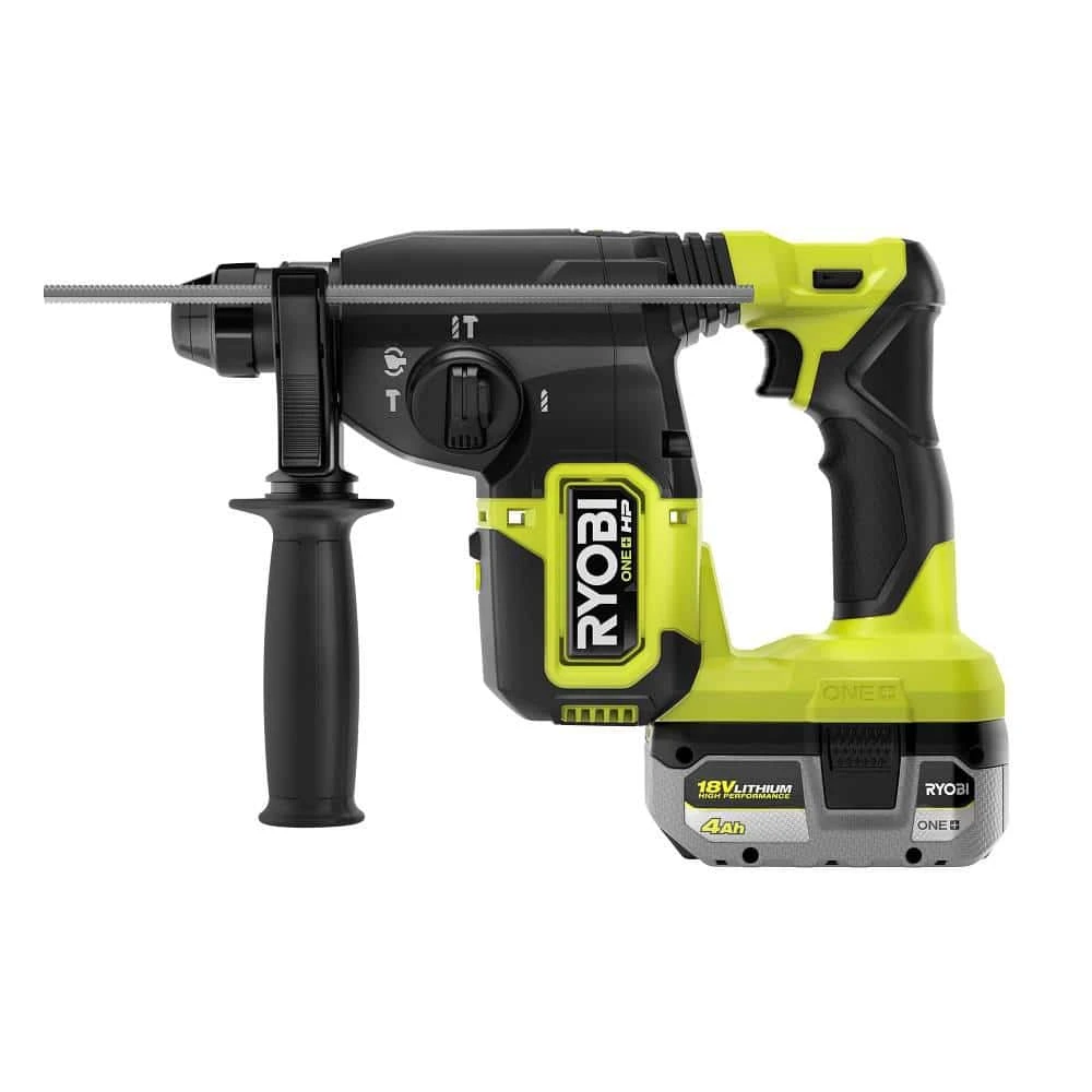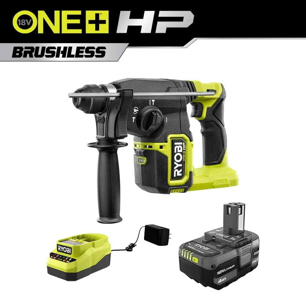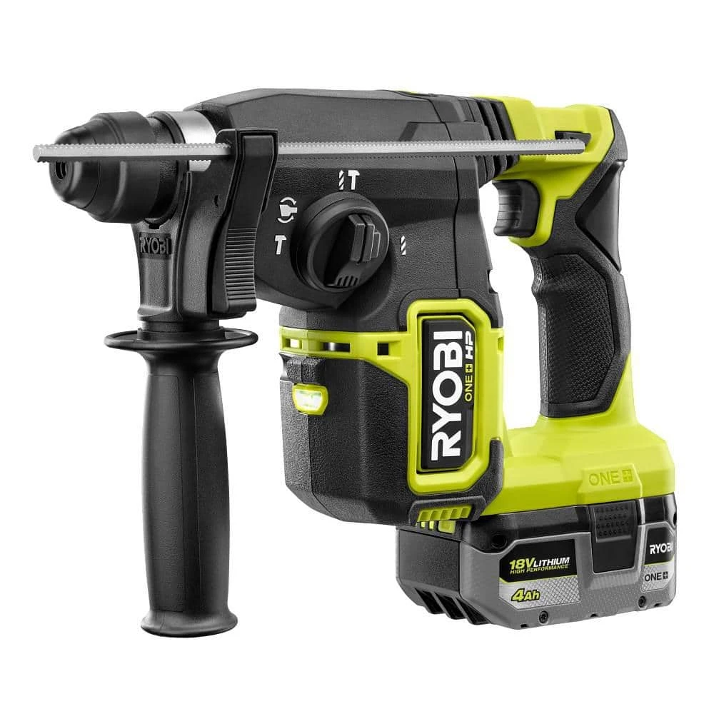 The RYOBI 18V ONE+ HP Brushless line of products is redefining power and performance. The RYOBI 18V ONE+ HP Brushless 1 in. SDS-Plus Rotary Hammer Drill Kit features a brushless motor delivering up to 75% more power and up to 2.1 Joules of impact energy, allowing users to dominate heavy-duty applications faster and more efficiently. The anti-vibration handle reduces fatigue by providing up to 47% less vibration, leading users to be more efficient on the jobsite. Alternating between the 3 modes, Drilling, Hammer Drilling, and Hammer accommodates the need of any application or material. Additionally, an auxiliary handle and depth guide come included to allow for increased control and precision. The included battery and charger are compatible with all RYOBI 18V ONE+ Tools. Best of all, it is part of the RYOBI ONE+ System of over 300 Cordless Products that all work on the same battery platform. This rotary hammer is backed by the RYOBI 3-Year Manufacturer’s Warranty and includes the P223 18V ONE+ HP Brushless 1 in. SDS-Plus Rotary Hammer, auxiliary handle, depth guide, and operator’s manual.