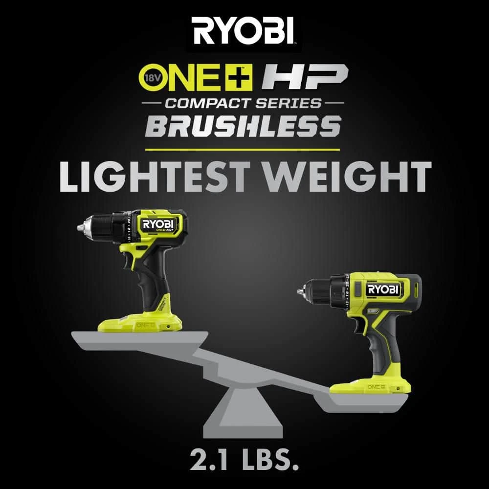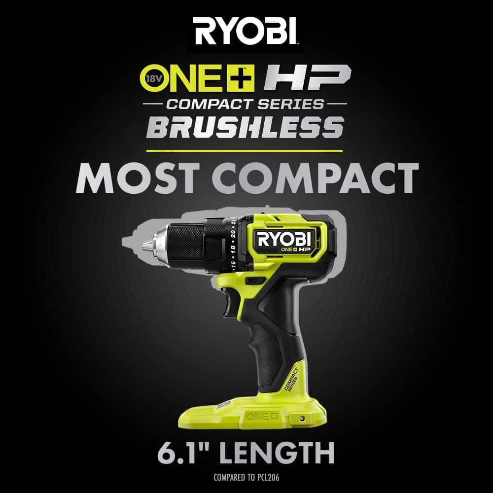 RYOBI introduces the 18V ONE+ HP Compact Brushless 1/2 in. Drill/Driver (Tool Only). This next generation of ONE+ HP compact brushless tools utilizes ONE+ HP Brushless technology to deliver more power, longer runtime, and longer motor life. Measuring at only 6.1