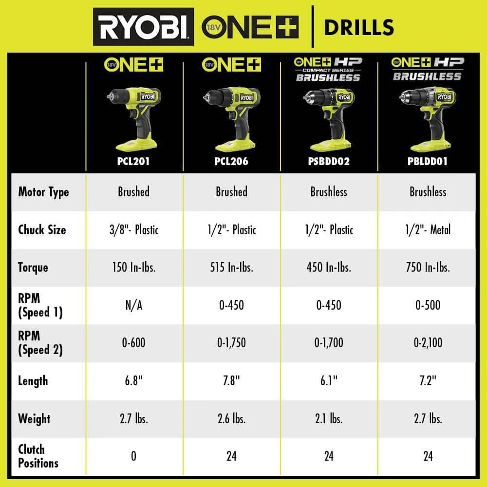 - Includes: (1) PSBDD02 ONE+ HP 18V Compact Brushless Cordless 1/2 in. Drill/Driver, (2) PBP002 1.5Ah Lithium Batteries, PCG002 Charger, Tool Bag and Operator’s Manual