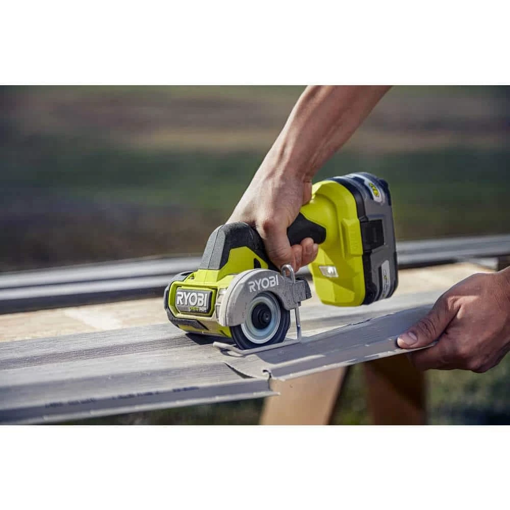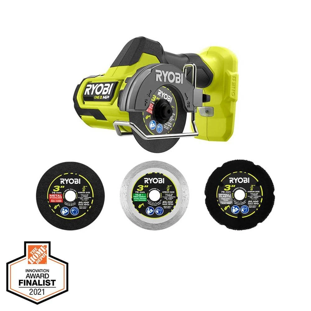 RYOBI introduces the 18V ONE+ HP Cordless Compact Cut-Off Tool (Tool Only) with Extra 3 in. Cut-Off Wheels (3-Pack). The powerful brushless motor produces up to 19,500 RPM. That’s enough power to cut through tough materials like metal, plastic, tile, cement board, drywall, wire shelving, PVC and vinyl siding. Measuring just 8.5 in. long, the cut-off tool is compact and lightweight—ideal for 1-handed operation and cutting in tight spaces. The dual LED lights illuminate both forward and reverse cutting directions, making it easier to see in dark spaces. In addition, the wire base ensures the tool is flat to the work surface for increased cutting accuracy and stability. All in all, this cutting tool makes a great addition to any tool user’s arsenal. It is also part of the RYOBI ONE+ System of over 300 Cordless Products that all work on the same battery platform. Backed by the RYOBI 3-Year Manufacturer’s Warranty, this ONE+ HP 18V Compact Brushless Cut-Off Tool includes a 3/8 in. Arbor, a 7/16 in. Arbor, 2 metal cut-off wheels, 2 carbide abrasive blades, 2 diamond tile blades, hex key, and operator’s manual. Batteries and chargers are sold separately.