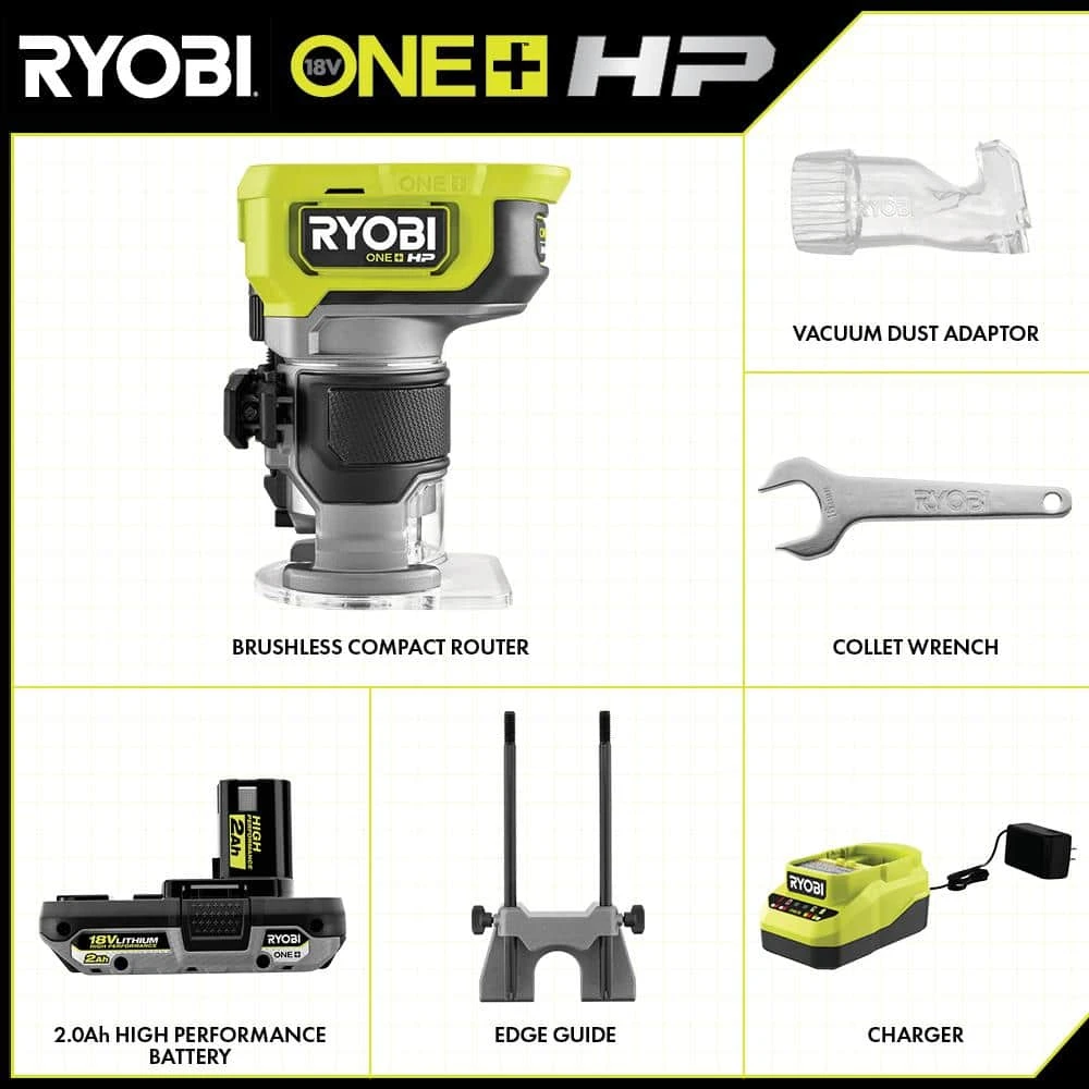 - Includes: PBLRR01 18V ONE+ HP Brushless Cordless Compact Router, 18V 2Ah Lithium HIGH PERFORMANCE Battery, Charger, Edge Guide, Collet Wrench, Vacuum Dust Adaptor, and Operator’s Manuals