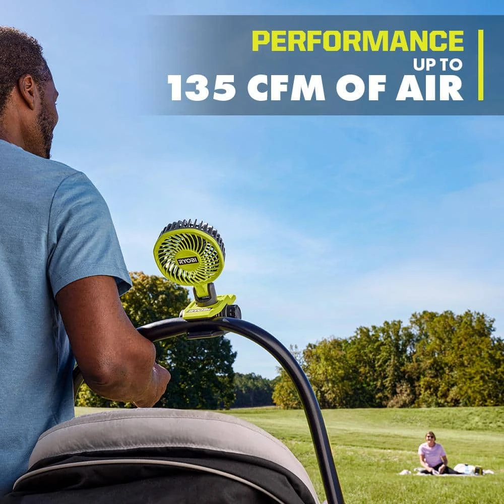 RYOBI introduces the USB Lithium Clamp Fan Kit. This USB Lithium Clamp Fan is our most compact and portable fan to date. Keep cool with over 7 hours of runtime and 2 speed settings. This fan is equally parts compact and powerful with up to 135 Cubic Feet per Minute (CFM). The multi-directional pivoting head and integrated clamp base with 1-1/4 in. clamp capacity makes this the ultimate versatile cooling solution. The compact size and integrated lanyard loops enhance this fan’s portability so you can bring it with you everywhere. This product features an LED indicator to signal when the battery is charged (green) or has low battery (red) while in-use. The USB Lithium Clamp Fan is part of the USB Lithium System that provides compact, portable, rechargeable solutions for cordless power and productivity. This USB Lithium Clamp Fan Kit is backed by the RYOBI 2-Year Manufacturer’s Warranty and includes (1) FVF51 USB Lithium Clamp Fan, (1) USB Lithium 2.0 Ah Battery, USB Cable, 3.0 Ah Battery, USB Lithium 3-Port Charger, and Operator’s Manual.