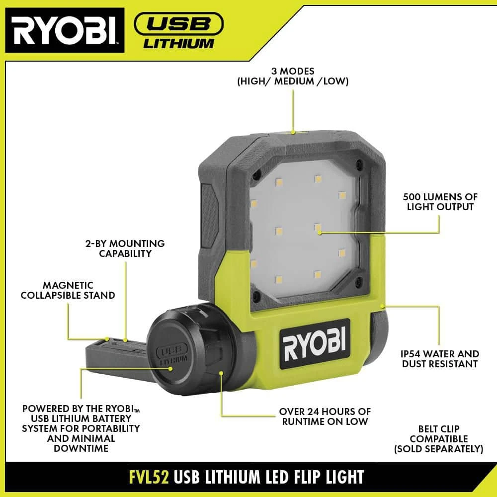 RYOBI introduces the USB Lithium Cordless Inspection Flashlight and Pivoting LED 3-Mode Flip Light Kit with (2) Batteries and Charging Cables. With up to 550 Lumens of 90+ high color render index light output and 3 light modes, this USB Lithium LED Inspection Light provides clear, bright and accurate color clarity in a durable compact design. This high color render light provides up to 32 hours of runtime and is the perfect solution for applications where seeing accurate color is crucial. This USB Lithium LED Flip Light provides 500 Lumens and has 3 light modes to provide the ideal amount of light needed every time. Mount and direct your light exactly where you need it with its pivoting stand, magnetic base, and 2-by mounting capability. This light delivers over 24 hours of clear coverage. Best of all, it is part of the RYOBI USB Lithium System of tools that provides compact, rechargeable, everyday solutions for cordless power and productivity. This USB Lithium Kit is backed by the RYOBI 2-Year Manufacturer’s Warranty and includes FVL56 LED Inspection Light, USB Lithium 2Ah Battery, USB Cable, FVL52 LED Flip Light, USB Lithium 2Ah Battery, USB Cable and Operator’s Manuals.